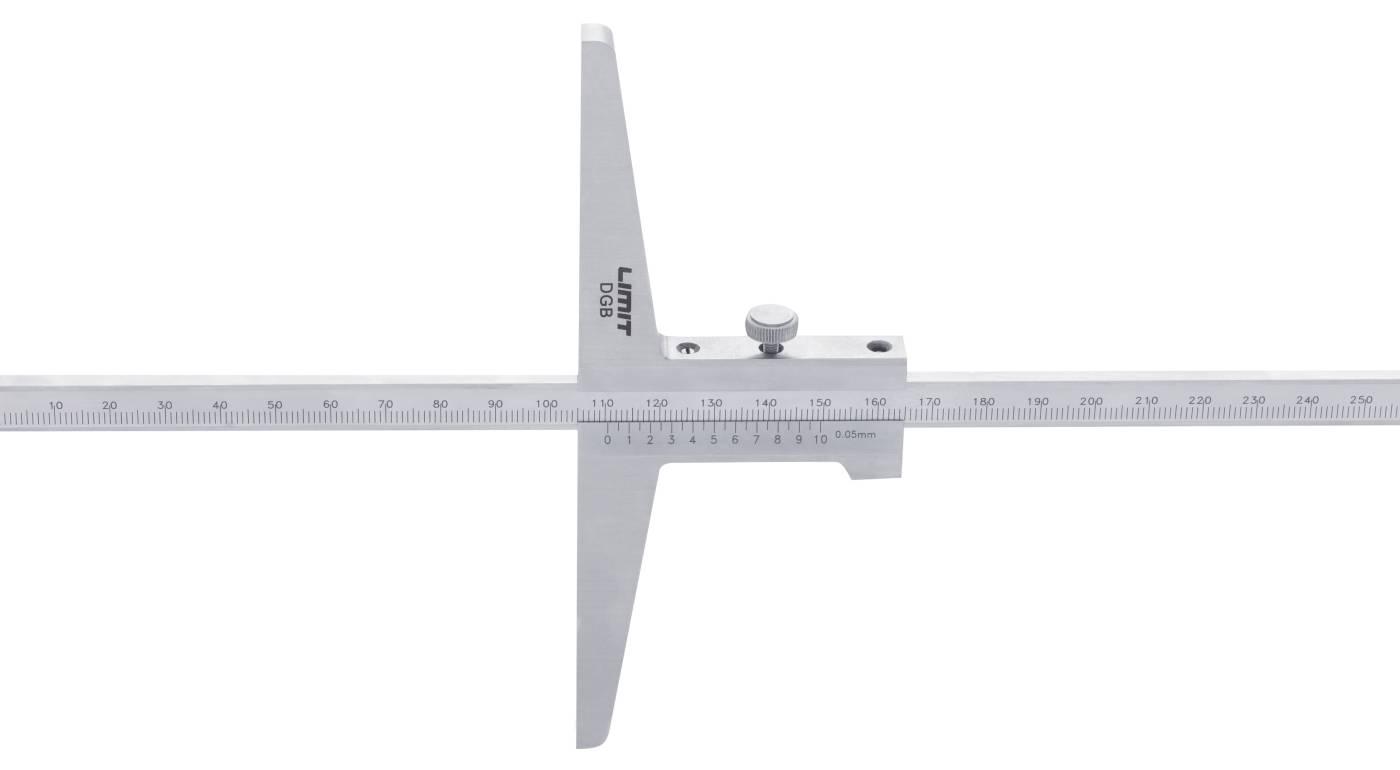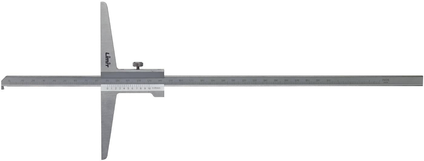 Dybdemål av rustfritt stål. Mattforkrommet skala. Gradert i millimeter. Nonieskala 0.05 mm. Toleranse i henhold til DIN 862.