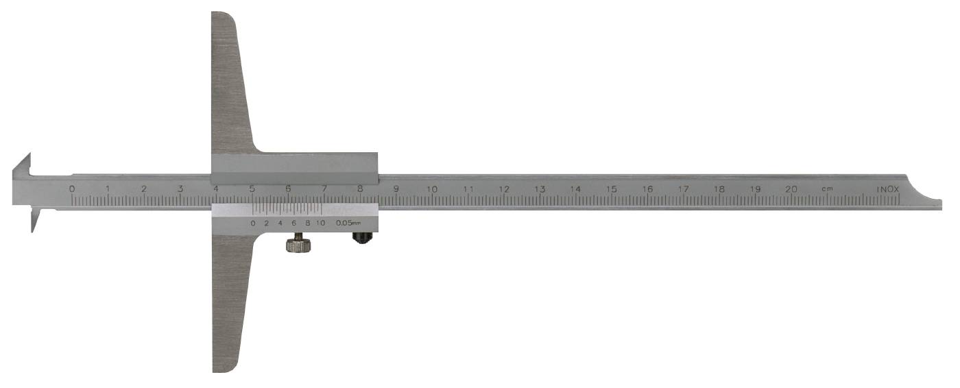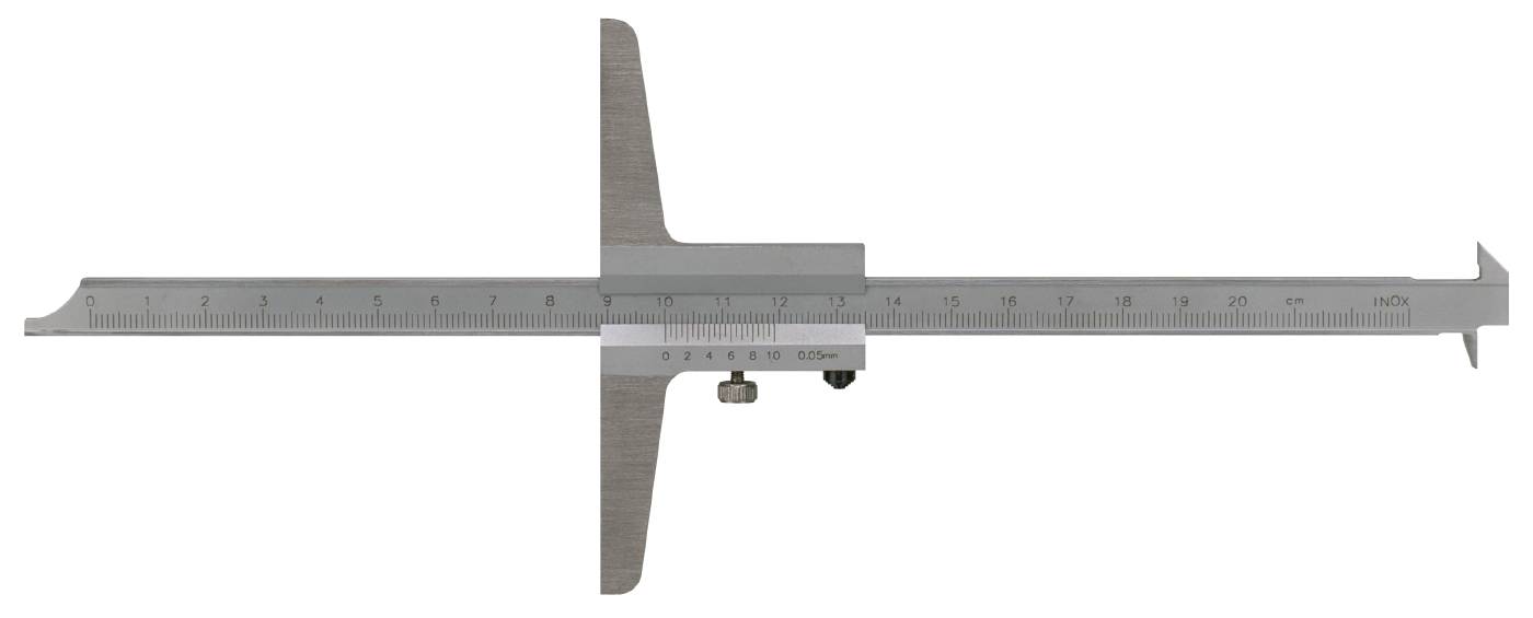 Av rustfritt stål. Mattforkrommet skala. Vendbar skala for måling med hake eller med spiss. Gradert i millimeter. Nonieskala 0.05 mm. Anleggets lengde er 100mm og hakens lengde er 6mm