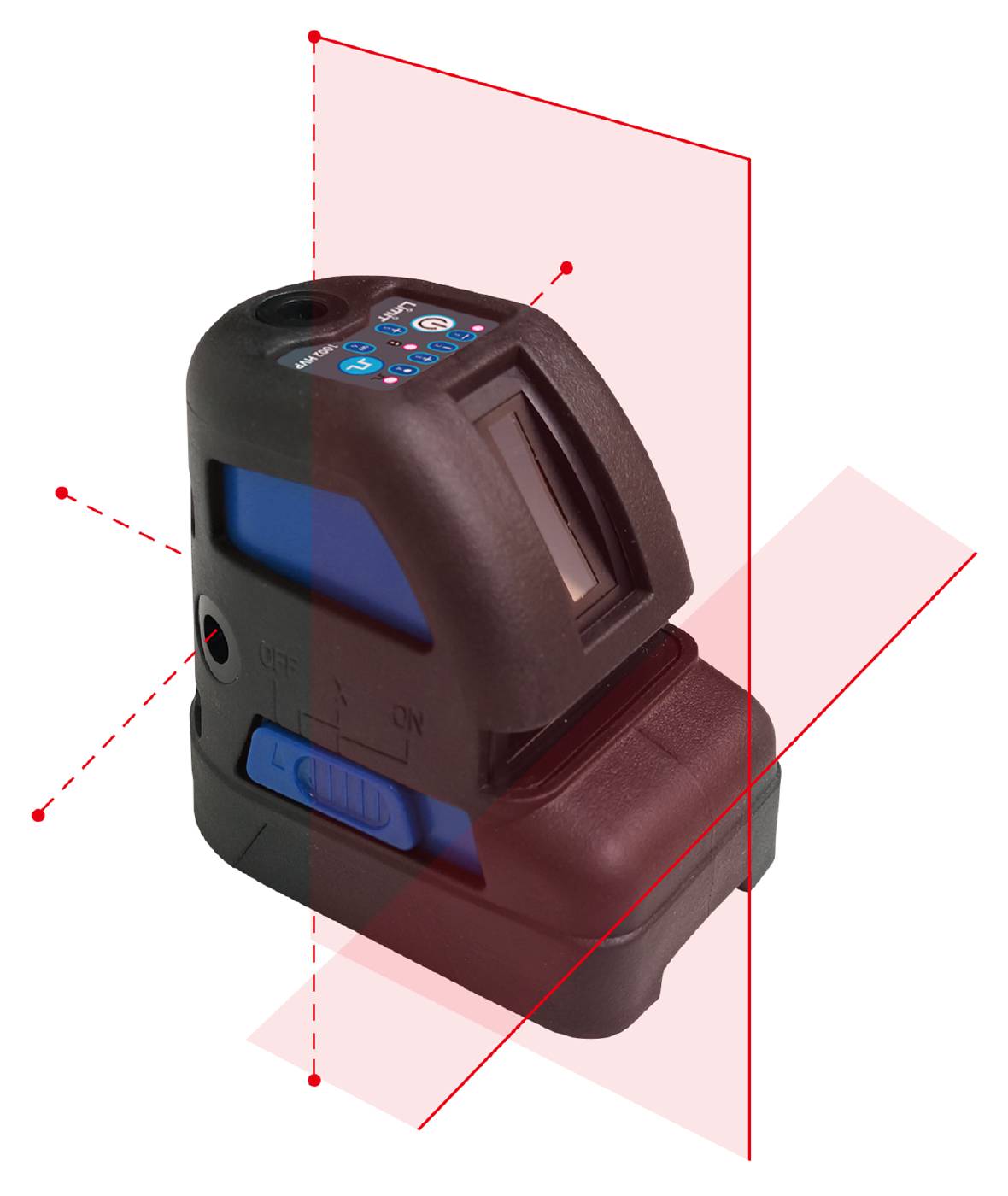 Kombinert krysslaser og punktlaser. Meget lyssterke og skarpe laserlinjer. En horisontal og en vertikal linje og 5 punkter. Den vertikale linjer når 115 grader opp i taket. Selvnivellerende med magnetisk pendeldemping. Varsler med blinkende laser og lyd når laseren ikke klarer å nivellere. Linjene og punktene kan tennes hver for seg eller samtidig. Hovedstrømbryteren gir mekanisk låsing av pendelen. Fungerer dermed som transportsikring.