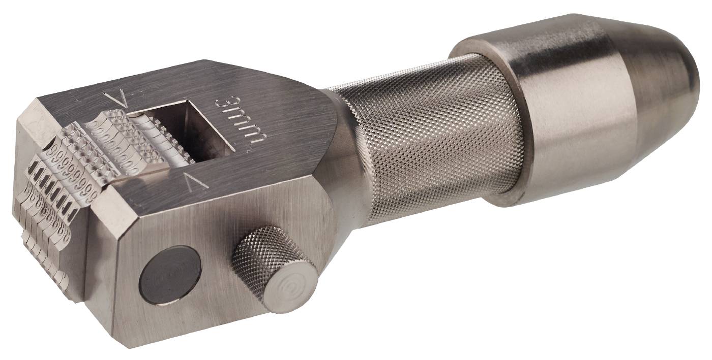 Stempelverk med 8 stempelhjul for stål og metall. For stempling i materialer med trekkholdfasthet opp til 150 kp/mm². Laget i verktøystål med spesialegenskaper for høy virkningsgrad. Pakket i plastboks.