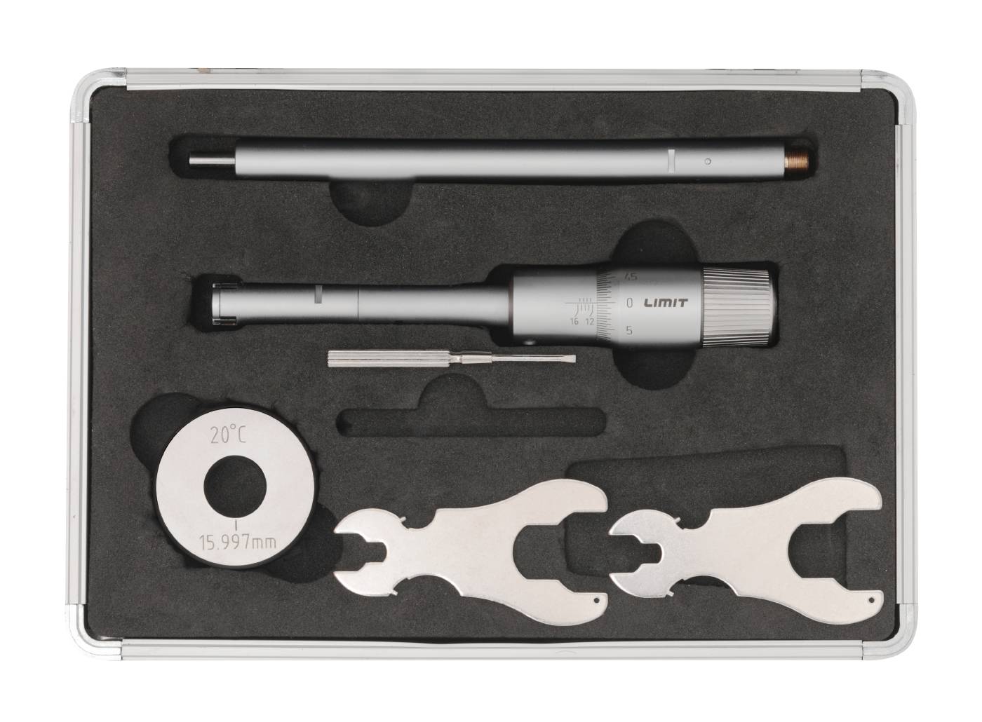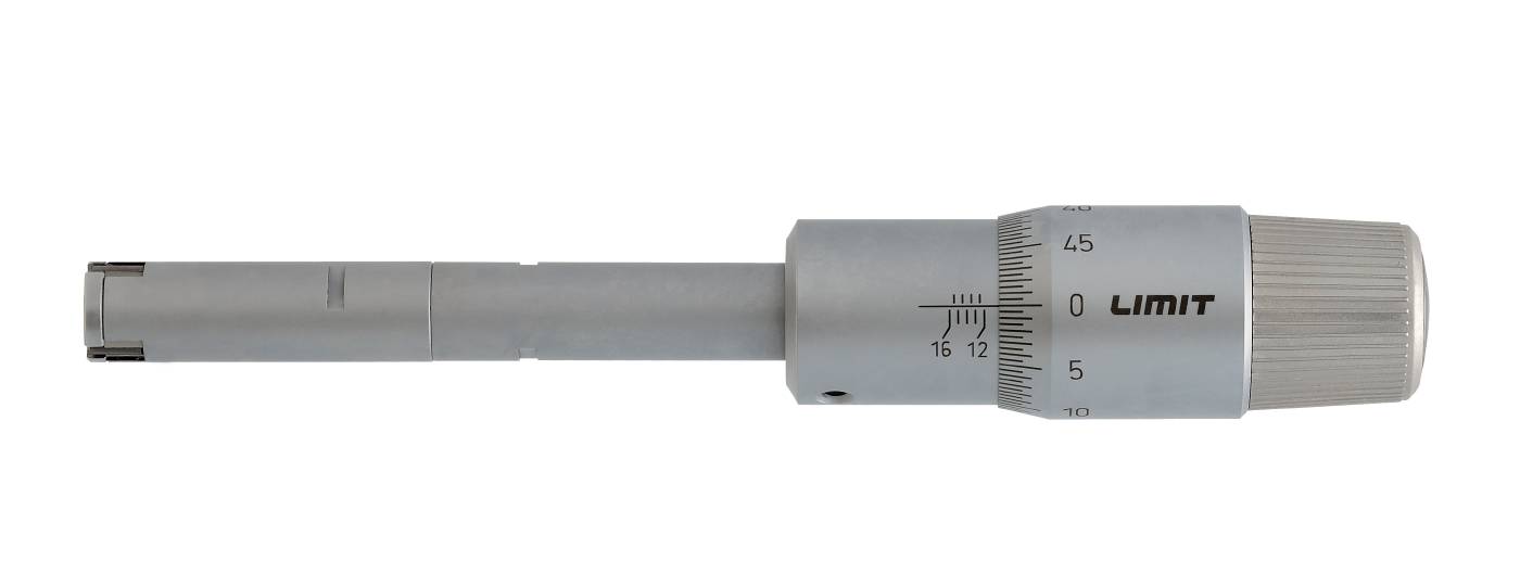 Trepunktsmikrometer og sett beregnet for hullmåling. Med friksjonsanordning som gir en konstant målekraft samt selvsentrerer måleboksen. Måleflater av hardmetall. Målespissene når til 0.5 mm fra bunnen av et blindt hull. Innstillingsring inngår. Det ene settet inneholder fire mikrometre i 20-50mm og det andre settet 63-100 mm samt 2 innstillingsringer i hvert sett. Leveres med forlenger og innstillingsring. Laget etter DIN 863/4.