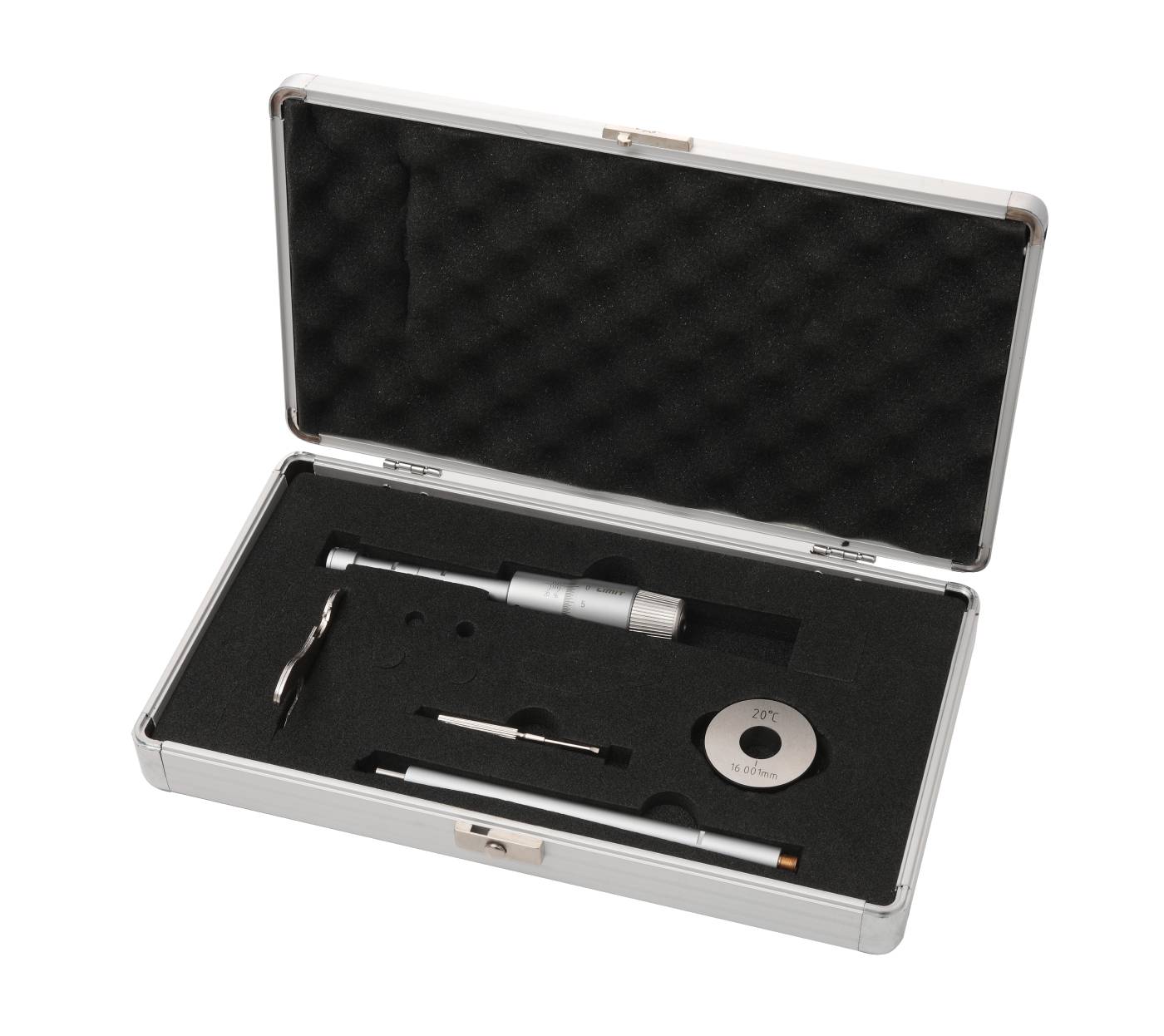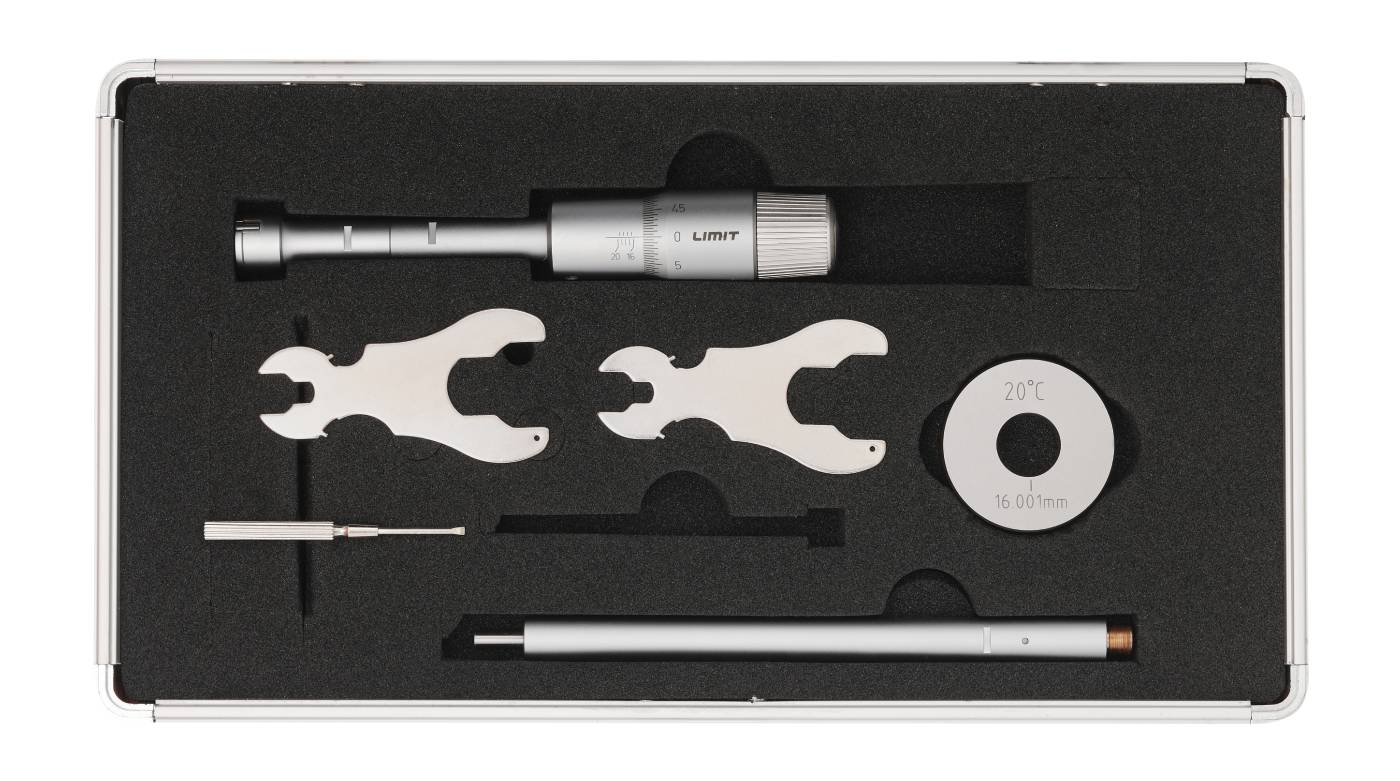 Trepunktsmikrometer og sett beregnet for hullmåling. Med friksjonsanordning som gir en konstant målekraft samt selvsentrerer måleboksen. Måleflater av hardmetall. Målespissene når til 0.5 mm fra bunnen av et blindt hull. Innstillingsring inngår. Det ene settet inneholder fire mikrometre i 20-50mm og det andre settet 63-100 mm samt 2 innstillingsringer i hvert sett. Leveres med forlenger og innstillingsring. Laget etter DIN 863/4.