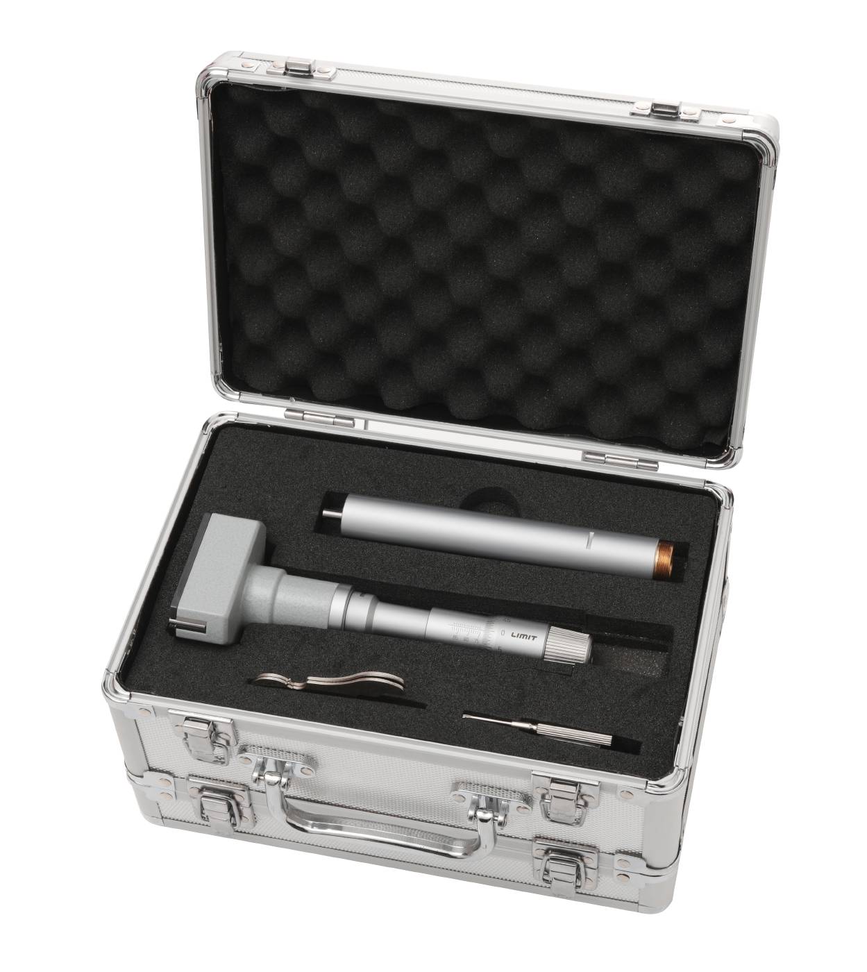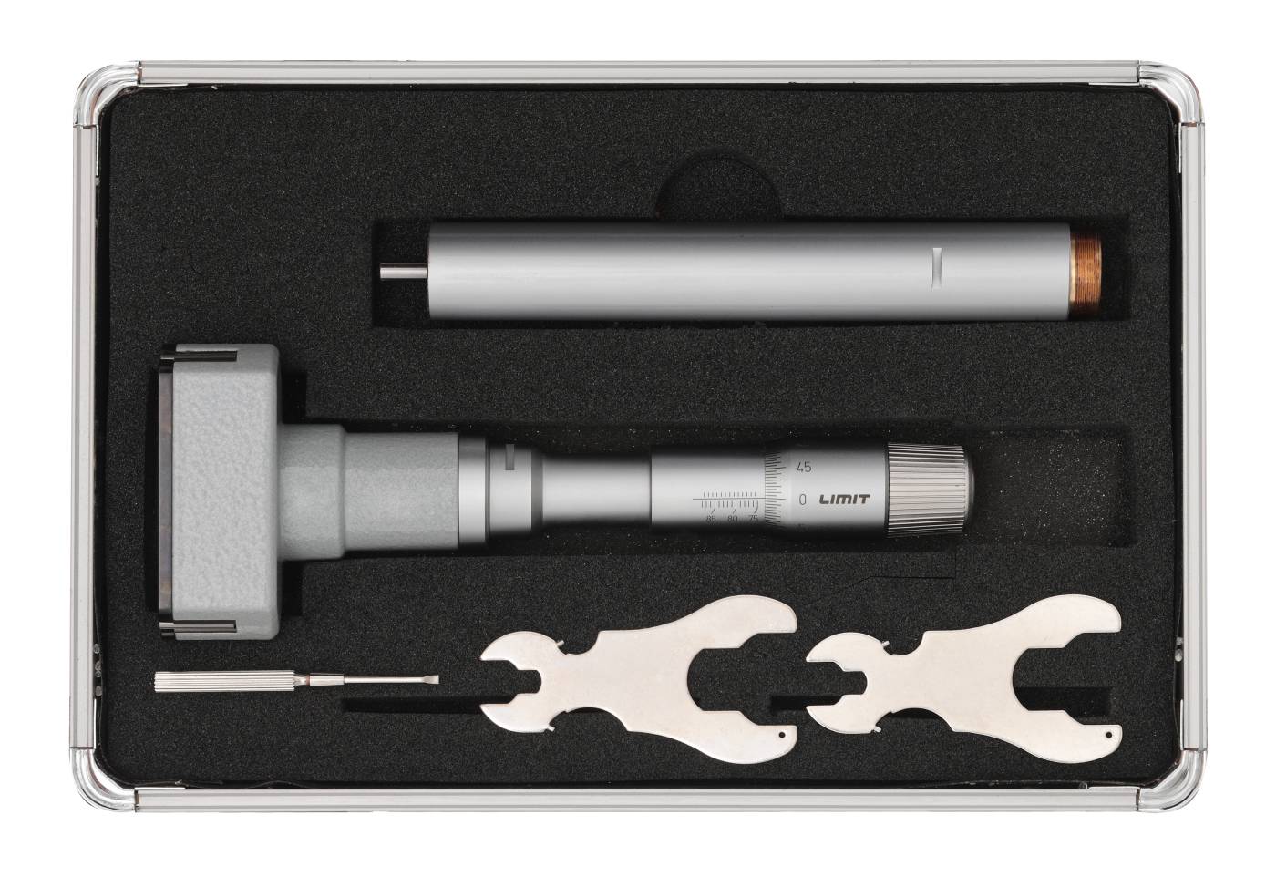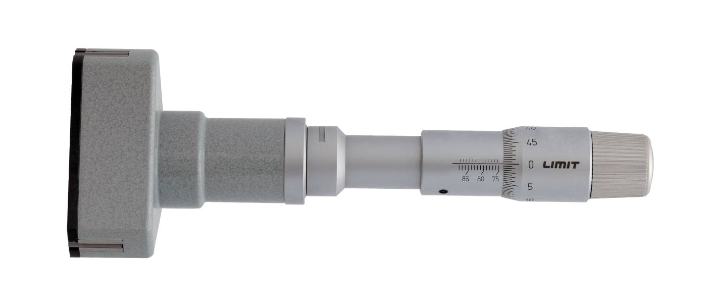 Trepunktsmikrometer og sett beregnet for hullmåling. Med friksjonsanordning som gir en konstant målekraft samt selvsentrerer måleboksen. Måleflater av hardmetall. Målespissene når til 0.5 mm fra bunnen av et blindt hull. Innstillingsring inngår. Det ene settet inneholder fire mikrometre i 20-50mm og det andre settet 63-100 mm samt 2 innstillingsringer i hvert sett. Leveres med forlenger og innstillingsring. Laget etter DIN 863/4.