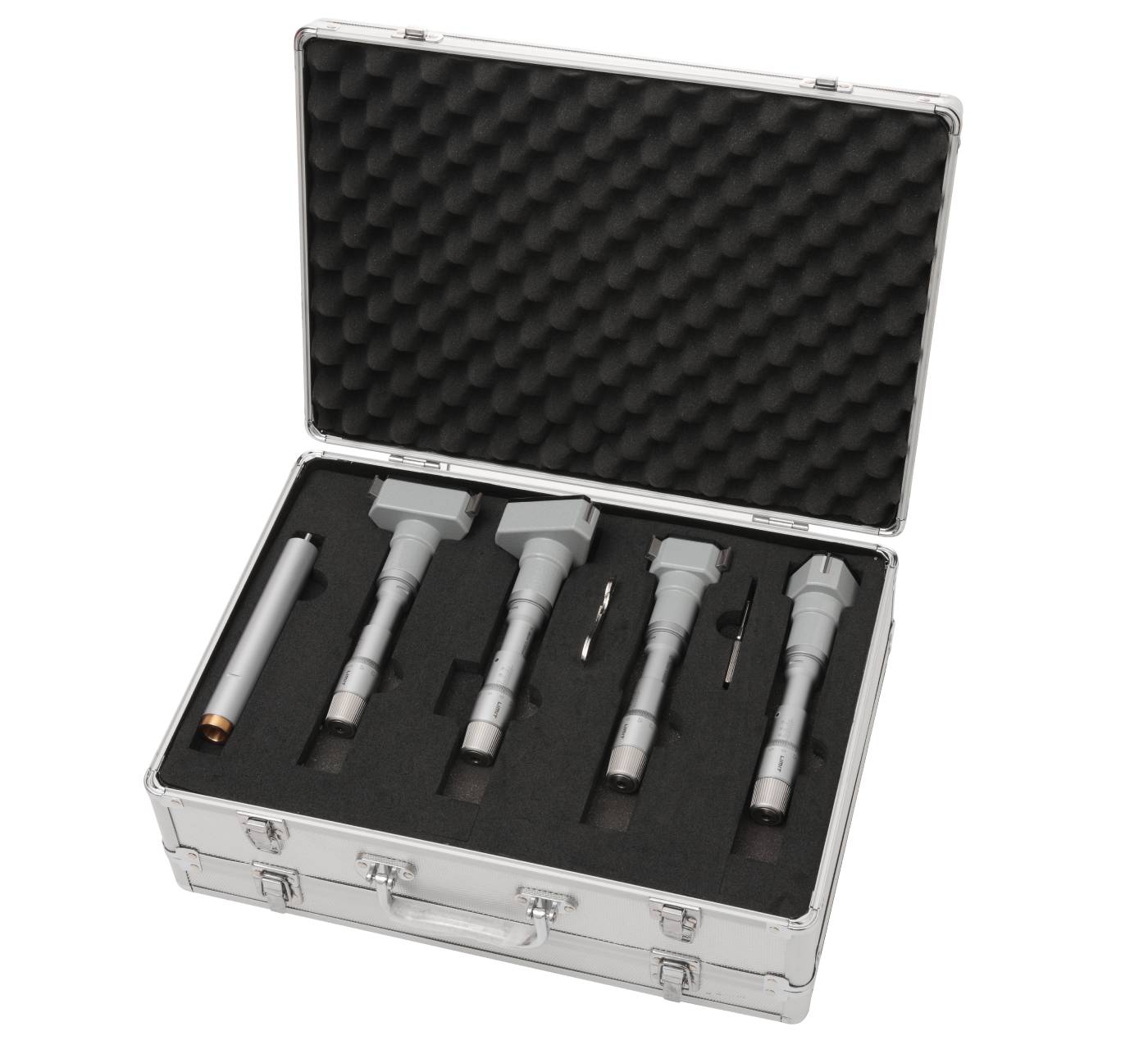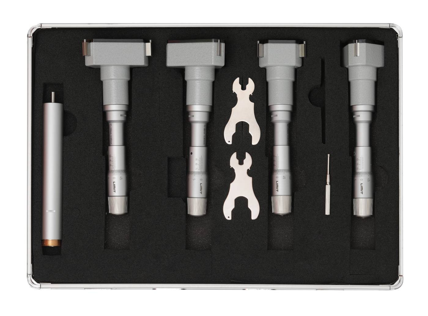 Trepunktsmikrometer og sett beregnet for hullmåling. Med friksjonsanordning som gir en konstant målekraft samt selvsentrerer måleboksen. Måleflater av hardmetall. Målespissene når til 0.5 mm fra bunnen av et blindt hull. Innstillingsring inngår. Det ene settet inneholder fire mikrometre i 20-50mm og det andre settet 63-100 mm samt 2 innstillingsringer i hvert sett. Leveres med forlenger og innstillingsring. Laget etter DIN 863/4.