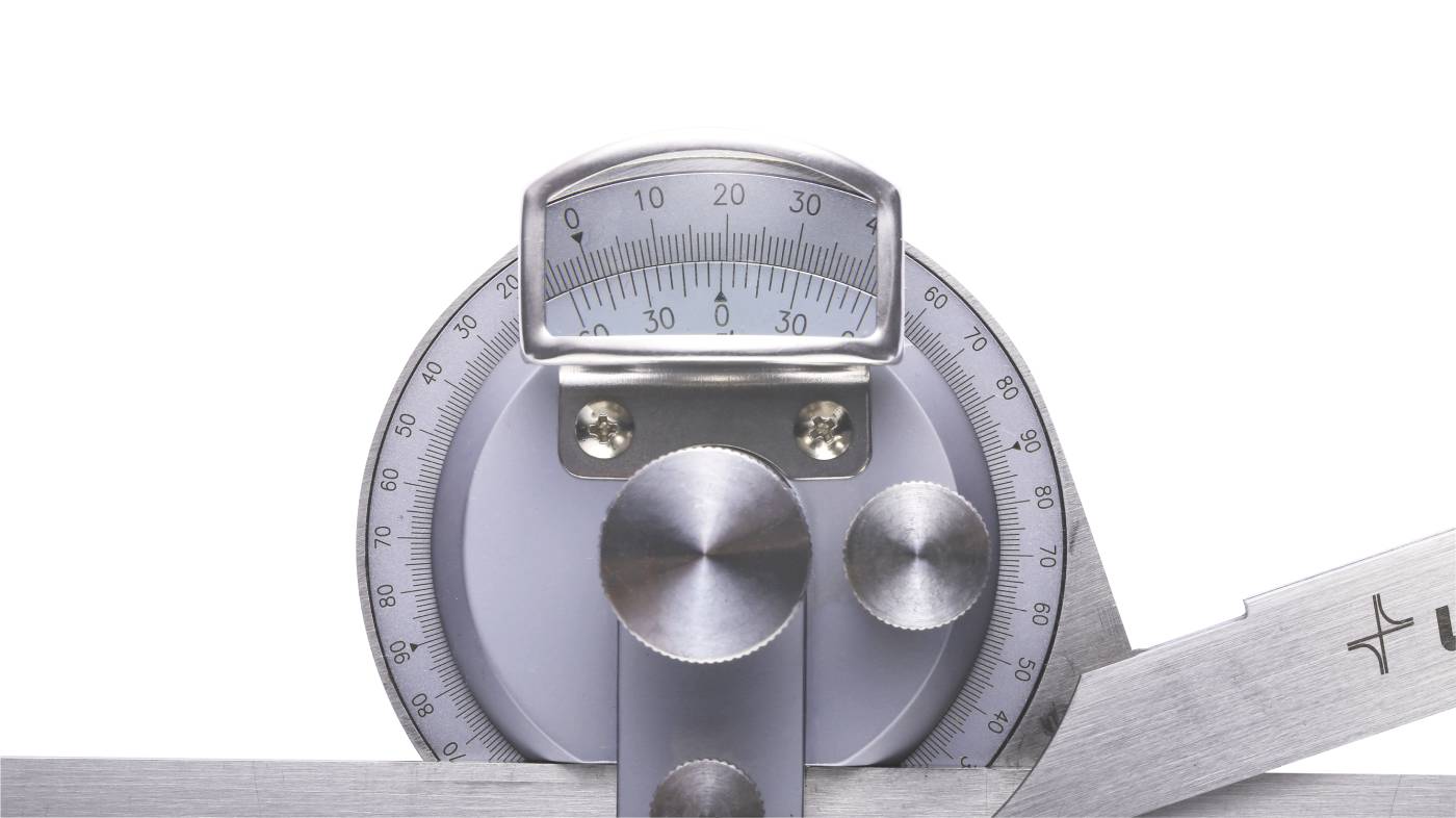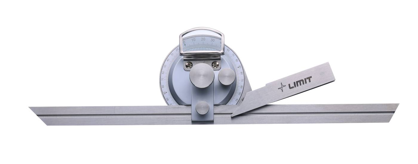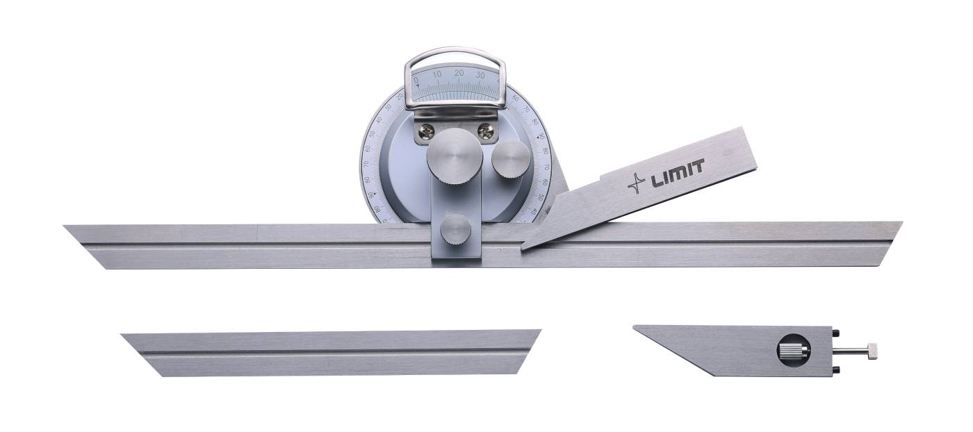 Presisjonsvinkel av rustfritt stål. Gradskiven har hele omkretsen gradert 0-90° i begge retningene og kan stilles inn i ønsket vinkel mot anlegget. Utstyrt med forstørrelsesglass for enkel avlesing. Med nonie for avlesing 1/12° = 5 minutter. De skyvbare skinnene er låsbare med låsemutter. Leveres med to utbyttbare klinger. Klingelengden er 150 samt 300 mm.
