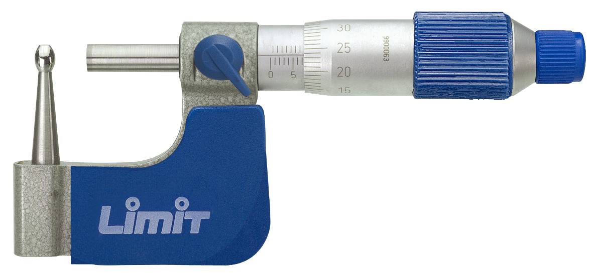 Kabłąk odkuwany, podziałka chromowana na mat. Hartowane wrzeciono 6.5 mm, z precyzyjnie docieranymi powierzchniami pomiarowymi z węglików spiekanych. Kowadełko kuliste 4.8 mm. Z tuleją sprzęgła i śrubą ustalajacą. DIN 863.