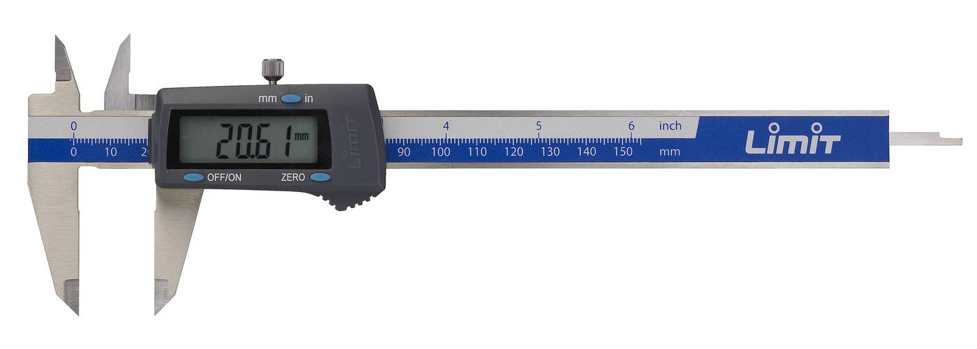 Digital caliper. Made of stainless steel. Can be switched between mm and inches. With reset button. Automatic off. DIN 862. Battery 3 V type CR2032.