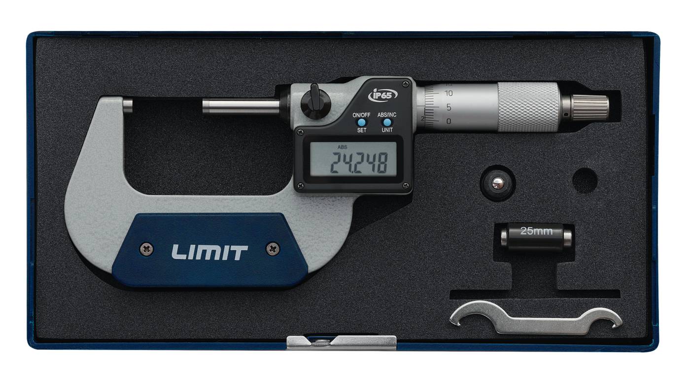 Digital micrometer with forged frame and class IP65 for quick reading of measurement results. Dust and waterproof. Hardened spindle with fine-polished tungsten carbide measuring faces. LCD screen with 7.5 mm digits. Buttons for switching the light on and off and various other functions. Friction sleeve and lock nut. Manufactured according to DIN 863. Battery type SR44, included.