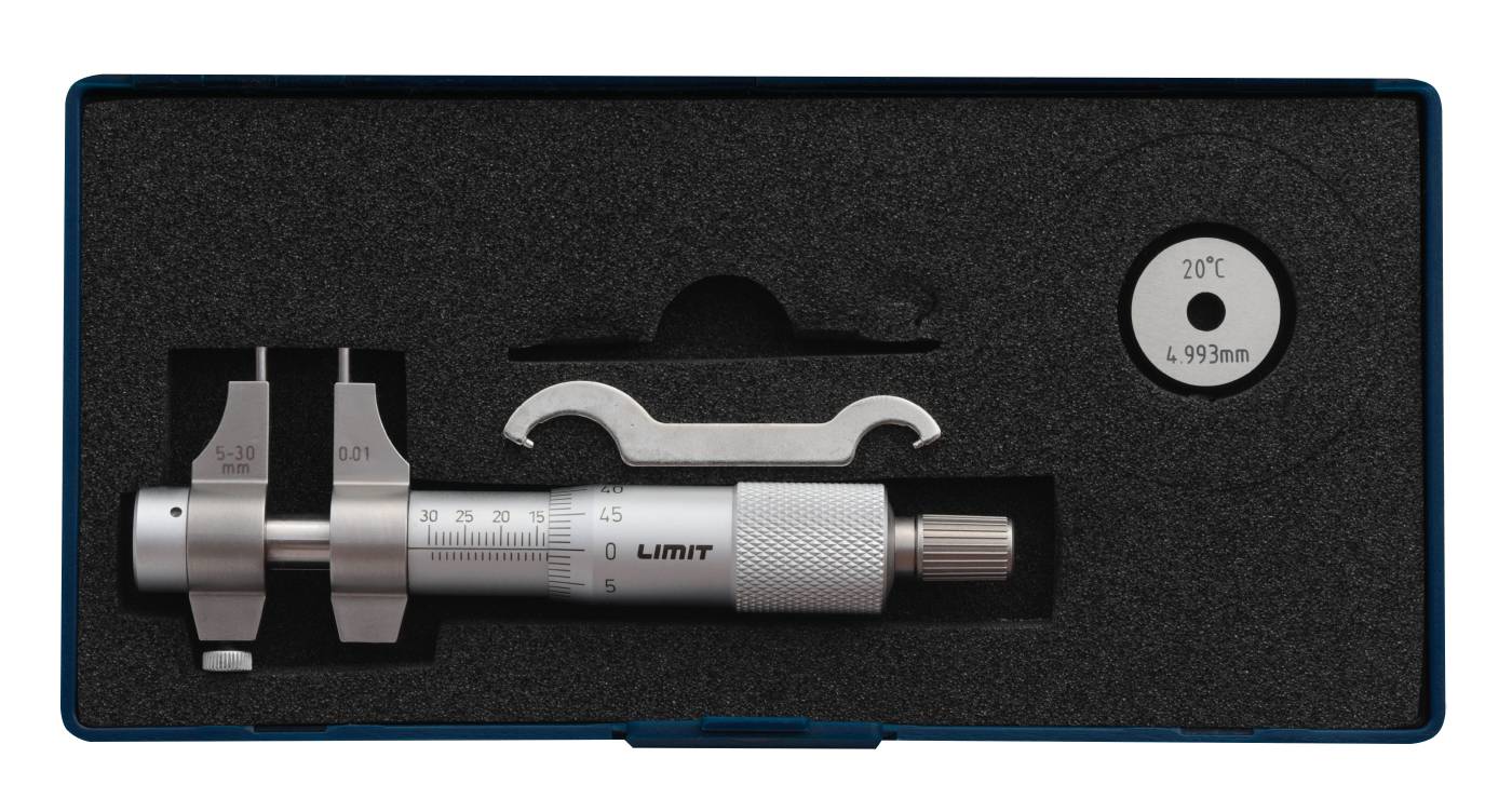 Inside micrometer, forged with matt chrome-plated scale. Hardened and fine-polished measuring faces. Friction screw and locking screw. Manufactured according to DIN 863. Supplied with setting ring.