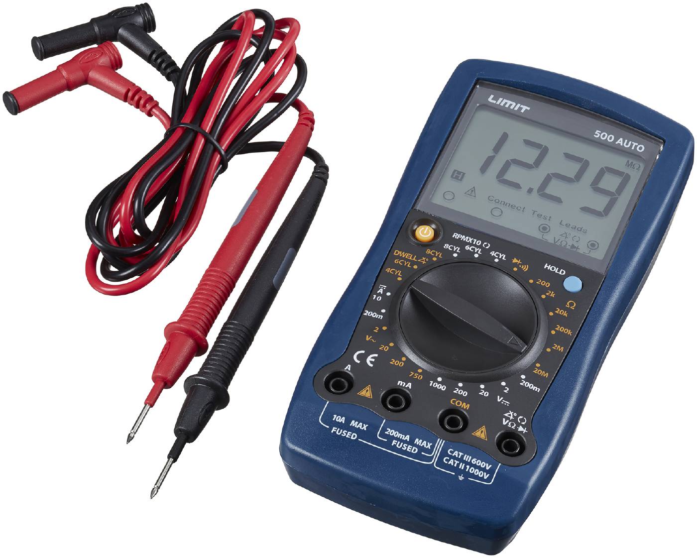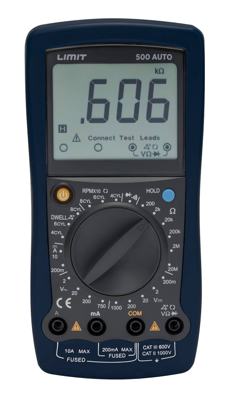 Digital automotive multimeter. Suitable for cars, boats, motor mechanics. Large display that even assigns the right cable socket and selected measurement range. For measuring direct/alternating voltage, DC, resistance, cam angle and speed. Also diode test, continuity test with buzzer, data hold, battery capacity warning.