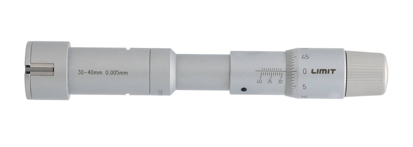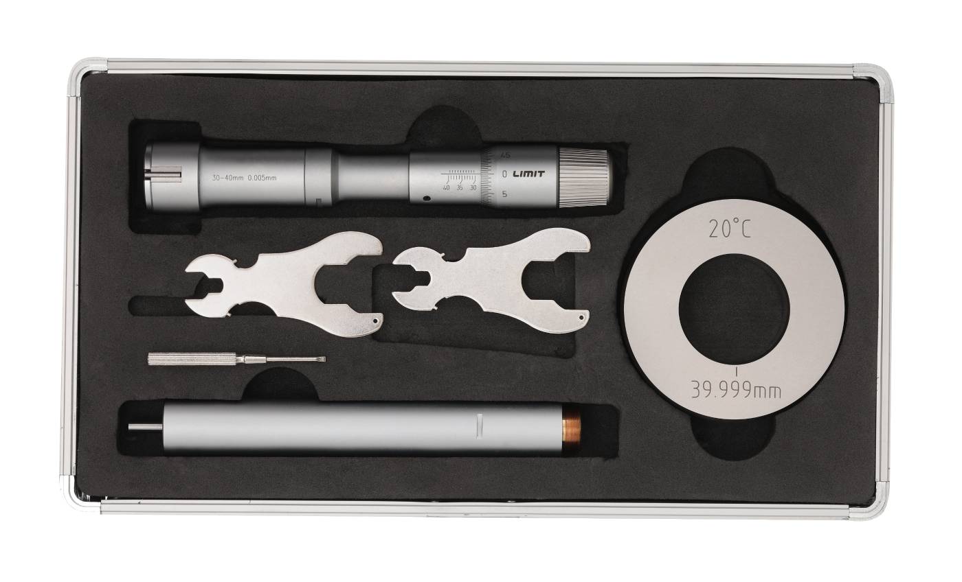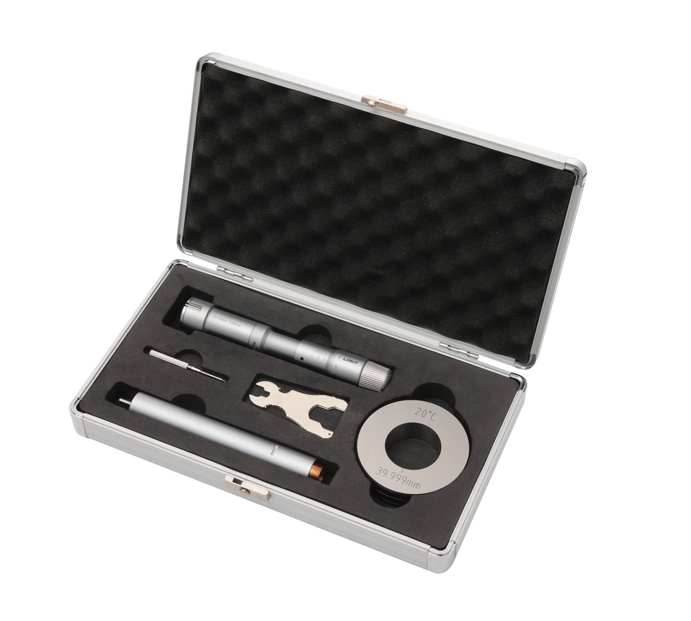 Three-point micrometer and kits designed for hole measurements. With a friction device that provides a constant measuring force and self-centres the device. Measuring surfaces made of tungsten carbide. The measurement tips reach down to 0.5 mm from the bottom of a blind hole. Setting ring included. One set includes 4 micrometers x 20-50 mm the other set 4 micrometers x 63-100 mm, plus 2 setting rings in each set. Supplied with an extension piece and setting ring. Manufactured according to DIN 863/4.